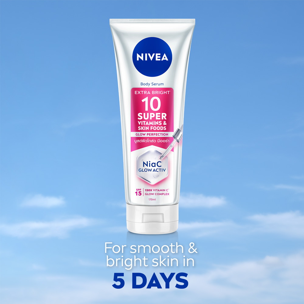 NIVEA Extra Bright 10 Super Vitamins and Skin Foods Body Serum is formulated with NiaC Glow Activ, featuring a powerful blend of Niacinamide and Vitamin C.