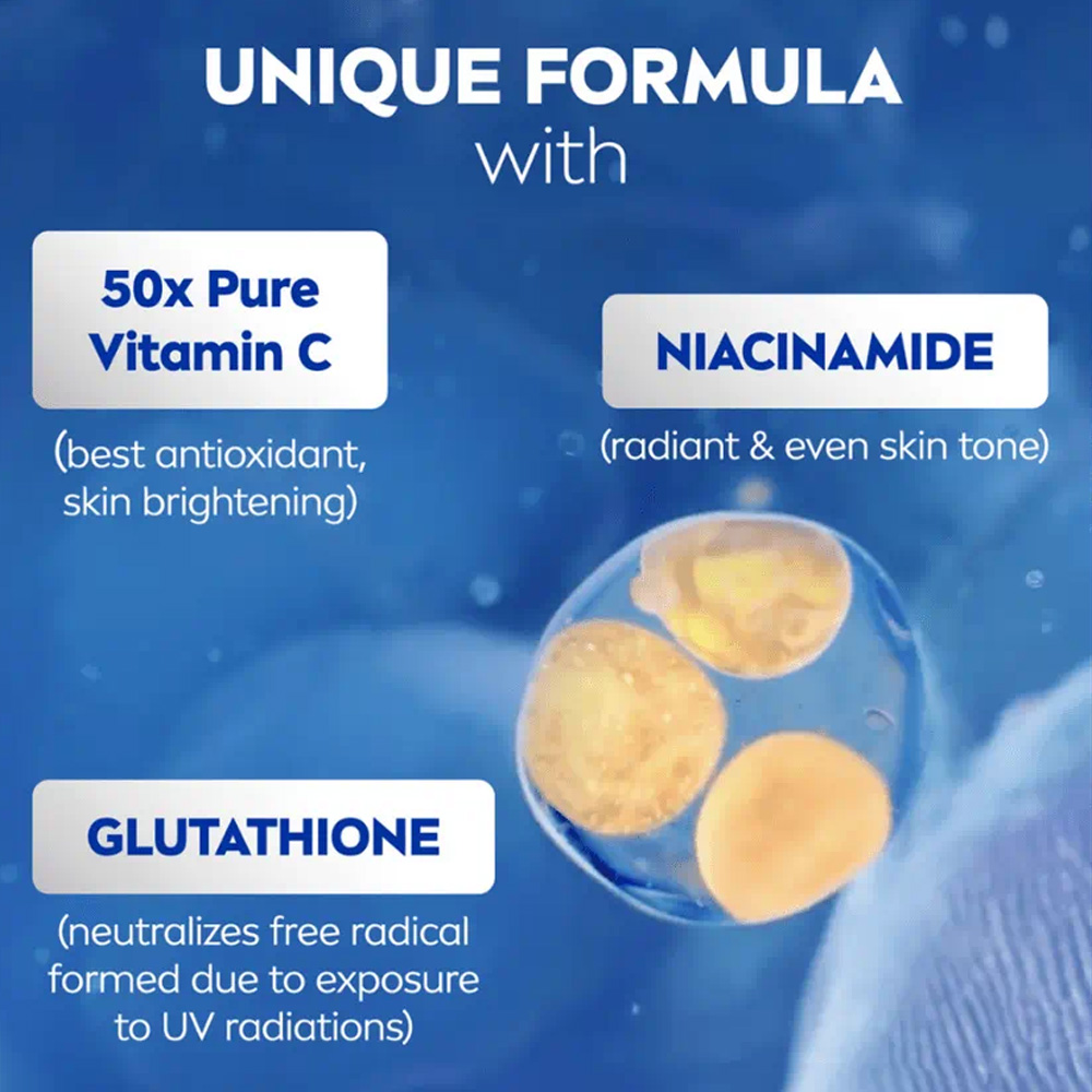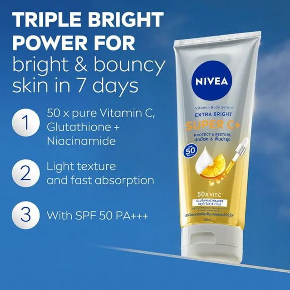 Nivea Extra Bright Super C+ SPF50 Vitamin Serum contains 50x Vitamin C to repair dull skin. The SPF50 to protect skin from the sun NIVEA Extra Bright Super C+ SPF50 is special formulated for Radiant & Bouncy skin. Ideal for daily use wherever skin needs care